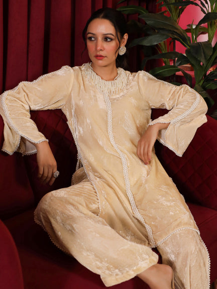 OLIVE GREEN VELVET KURTA SET WITH PAISLEY WORK