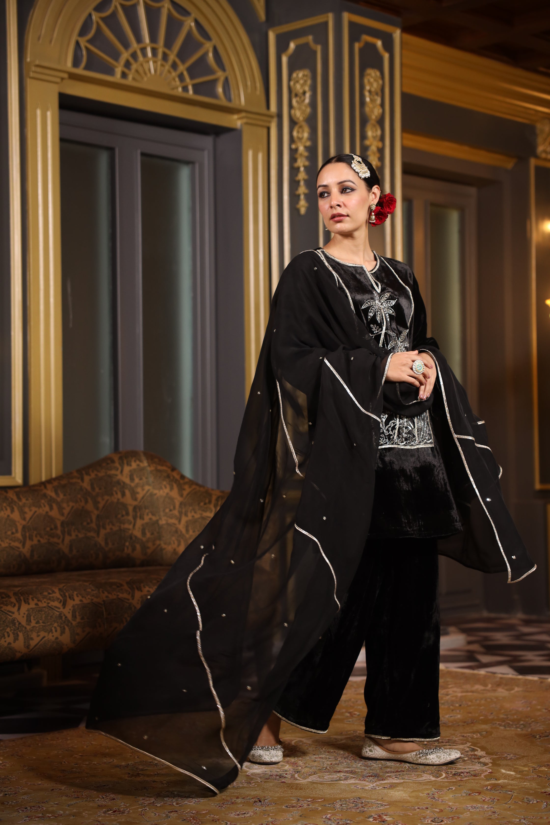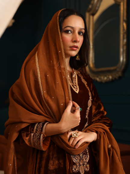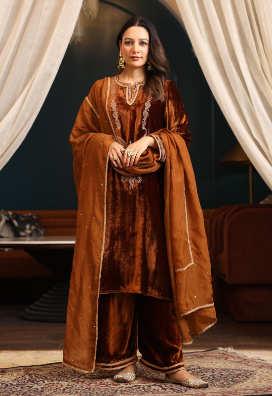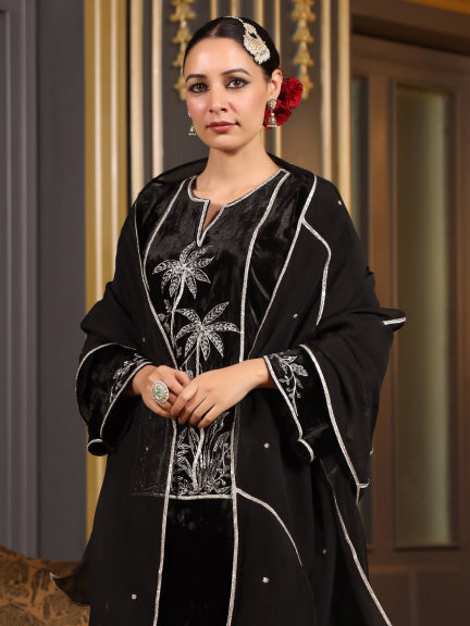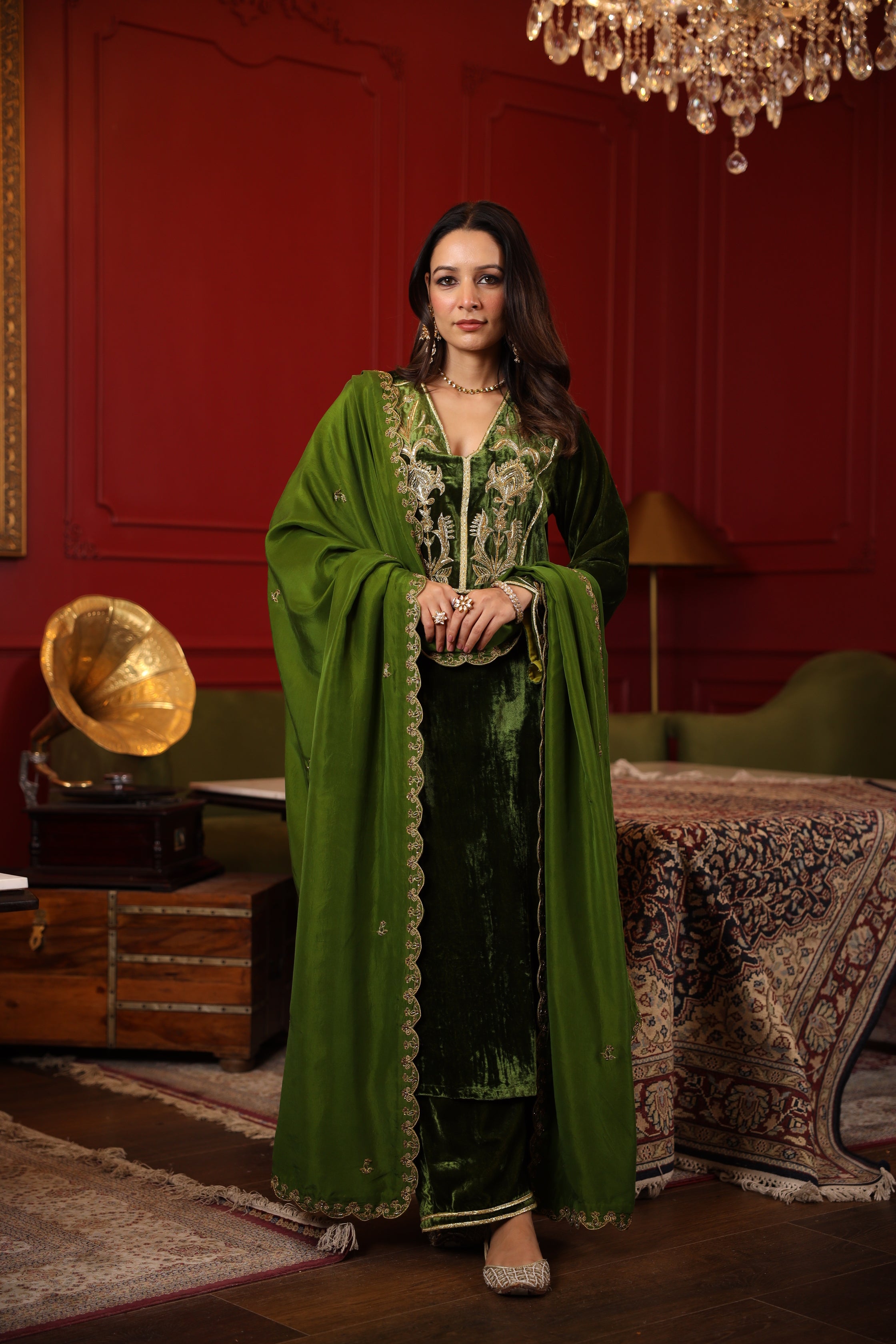 OLIVE GREEN VELVET KURTA SET WITH PAISLEY WORK