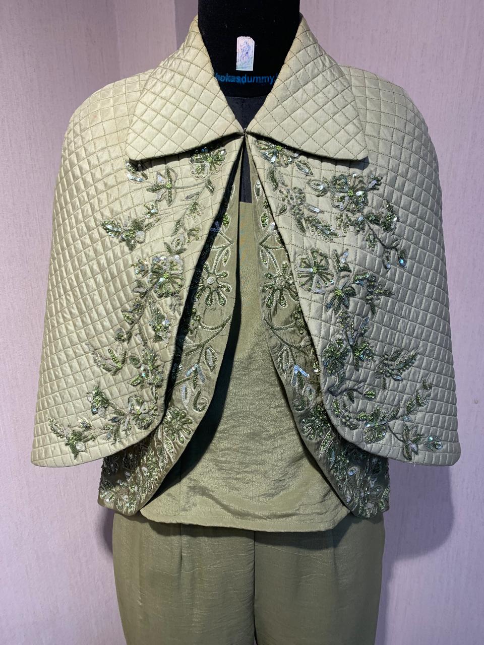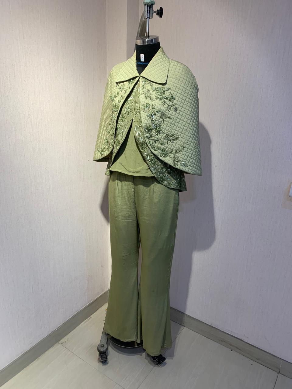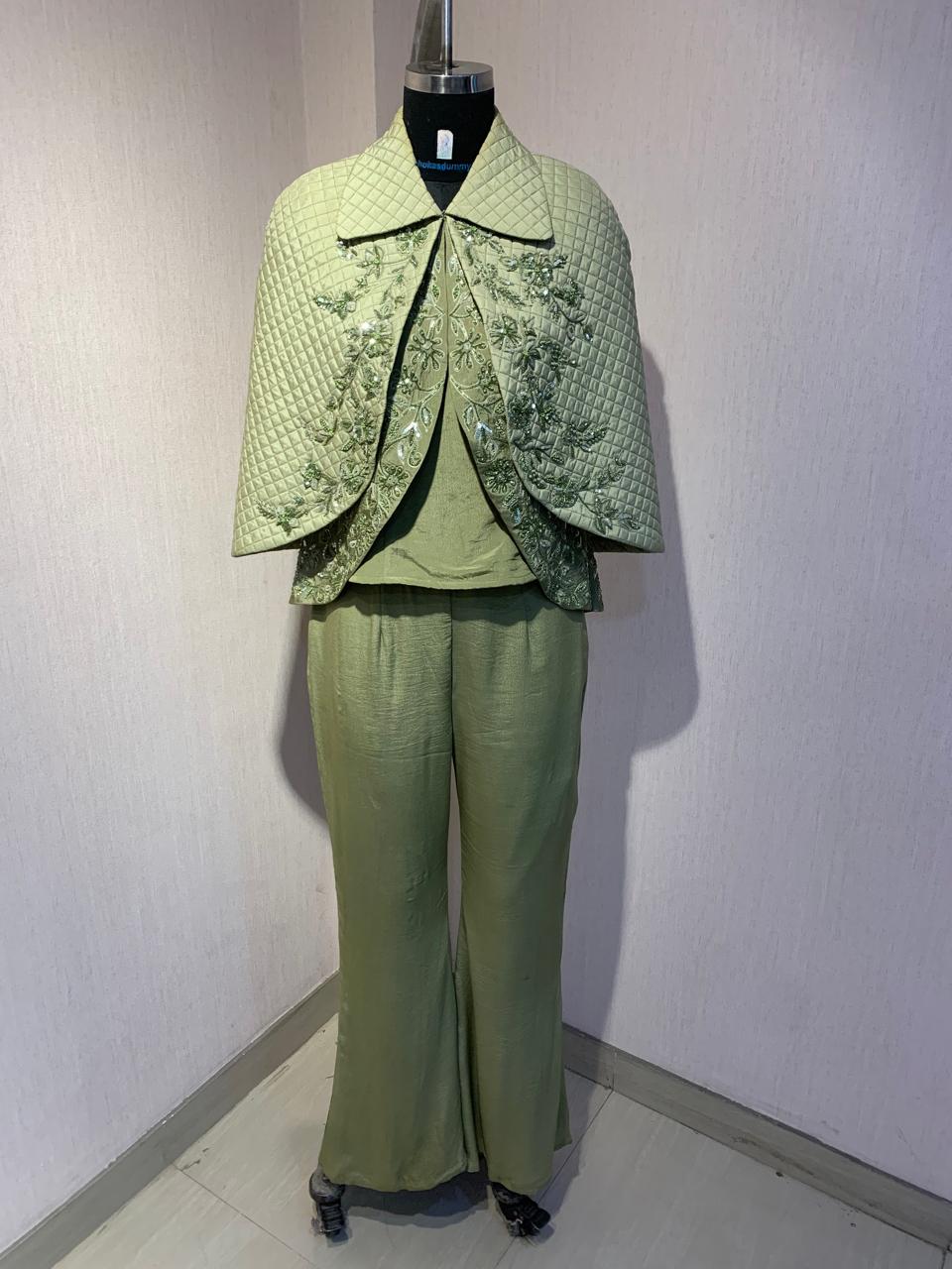 Inform when this item available SAGE GREEN QUILTED EMBROIDERED JACKET WITH INNER & PANTS.