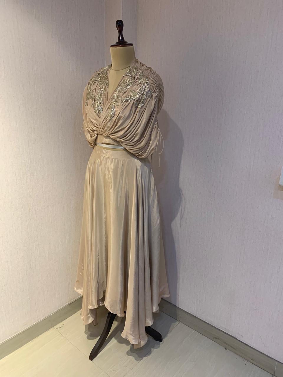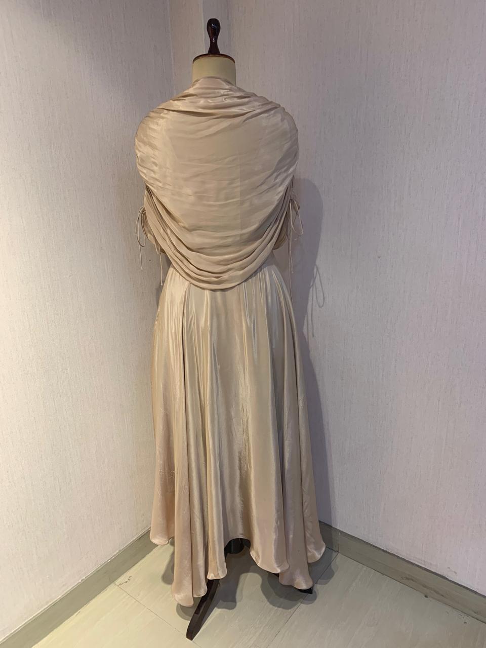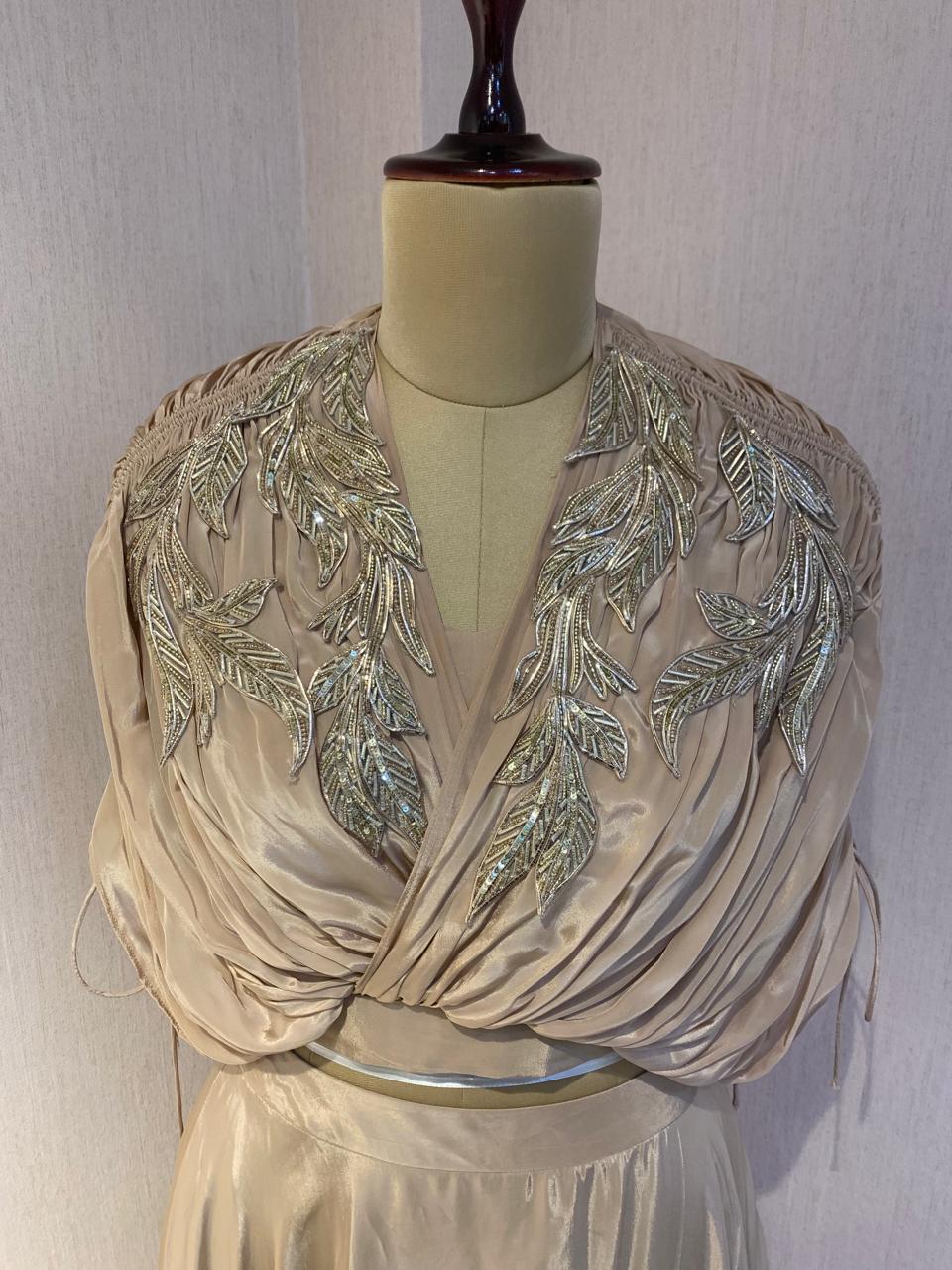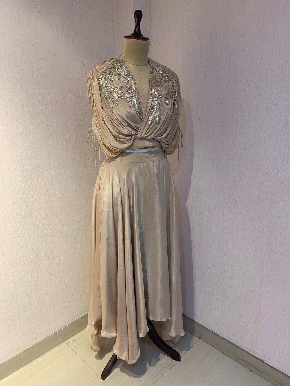 Inform when this item available BEIGE BEAD AND WIRE EMBELLISHED CAPE TOP WITH DRAPED SKIRT.