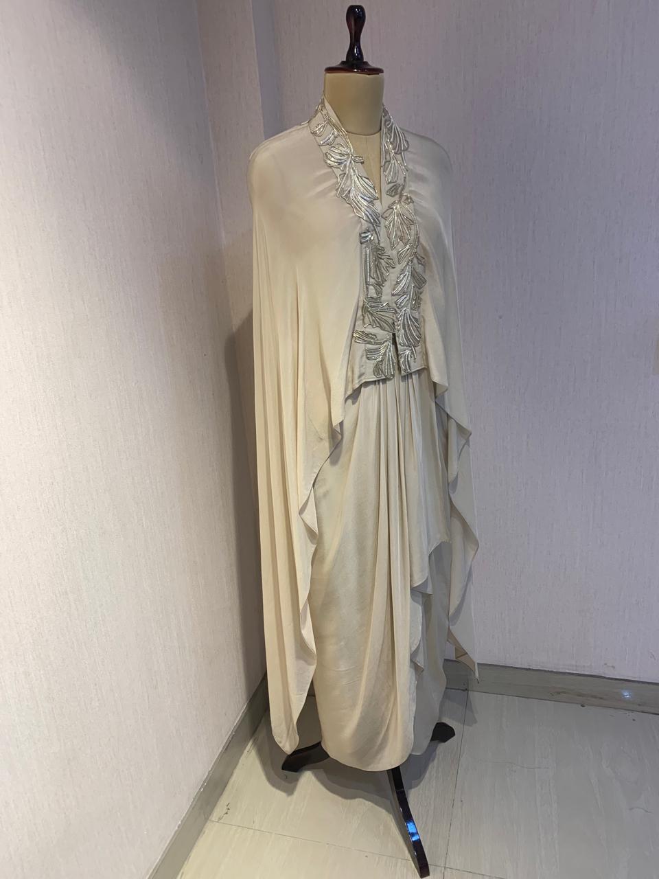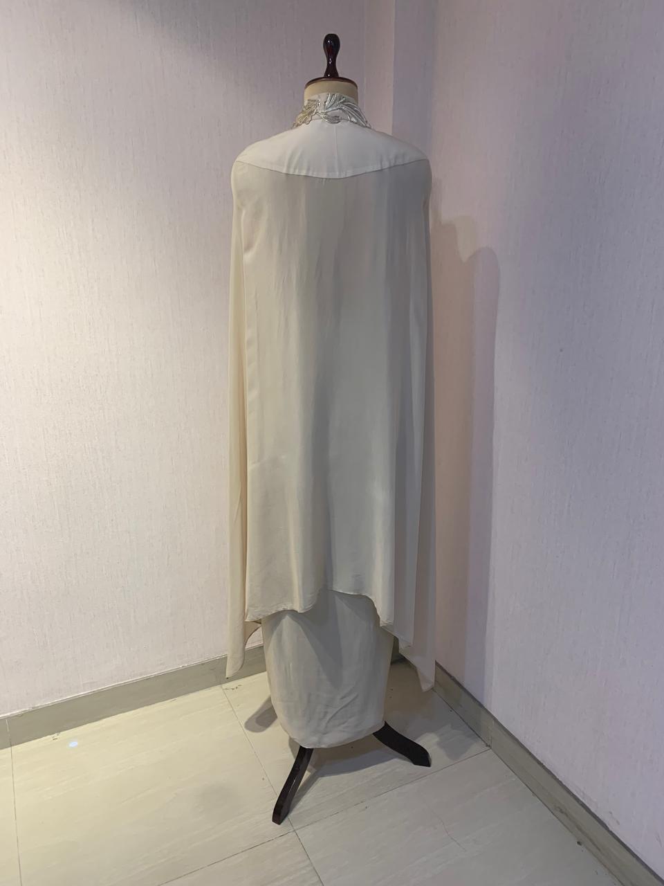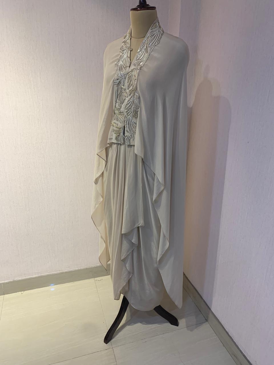WIRE EMBELLISHED LAYERED TOP WITH INNER AND DRAPED SKIRT. - Beige / SMALL / crepe