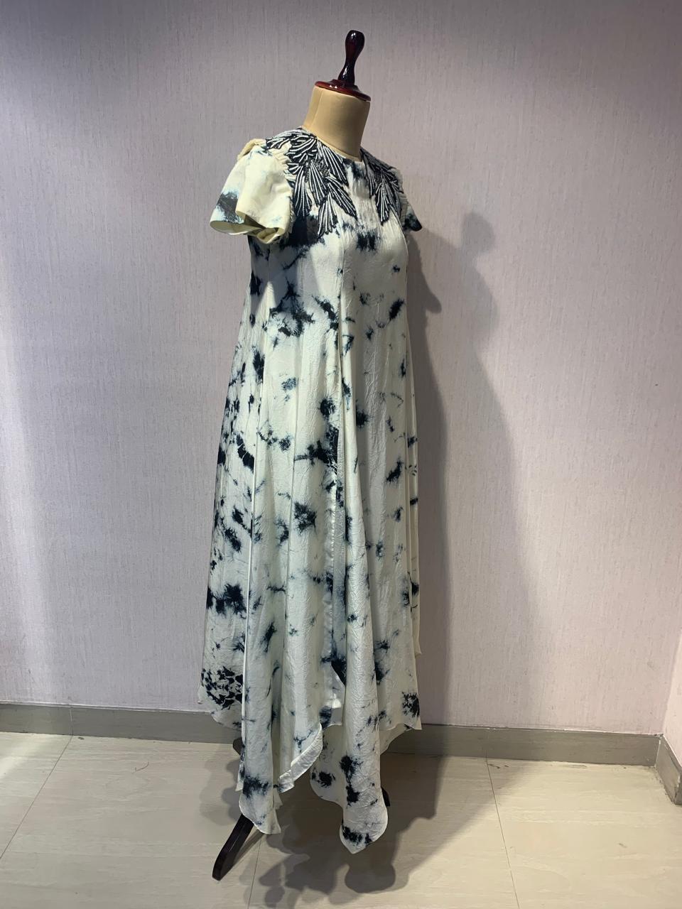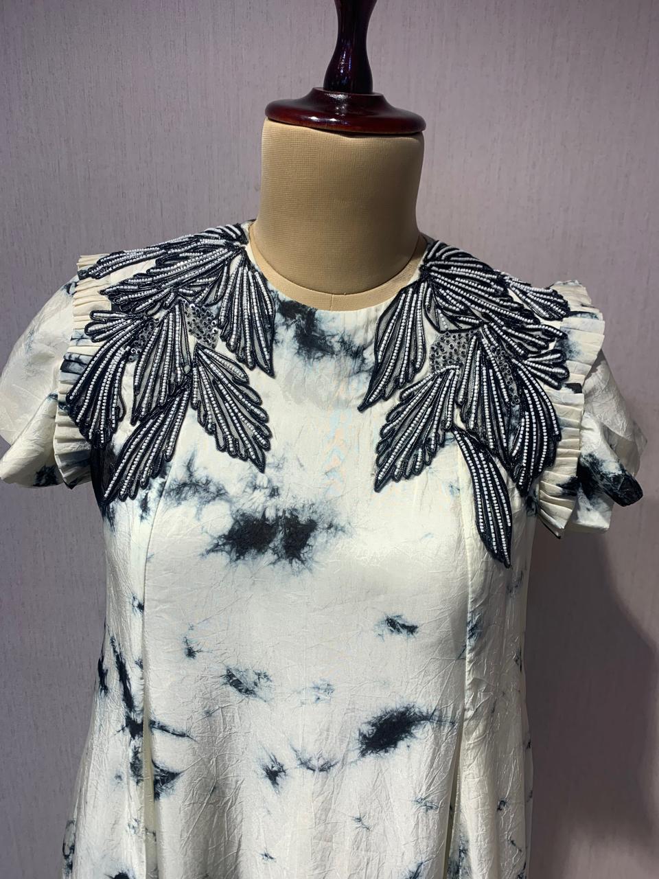 MARBLE PRINT SHORT-SLEEVE EMBROIDERED DRESS. - White / SMALL / Silk