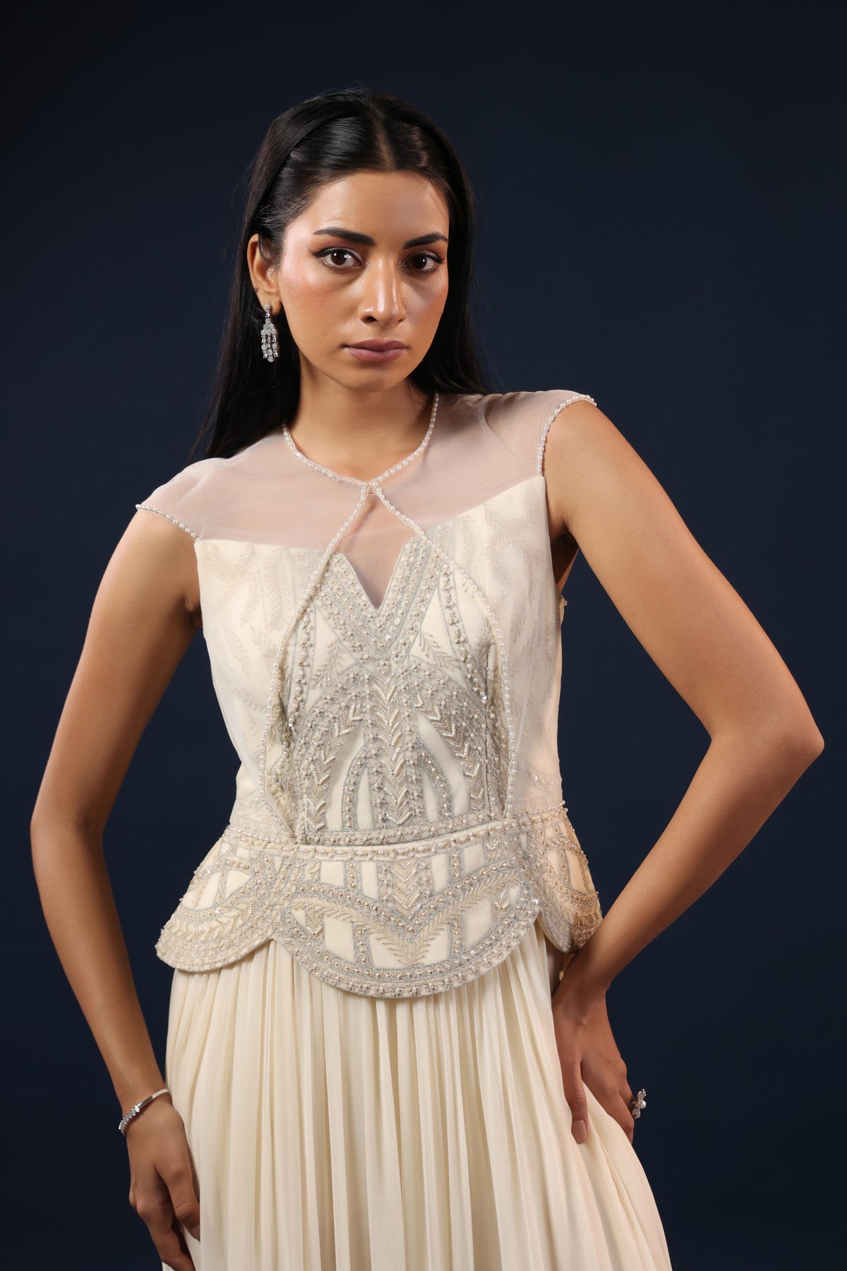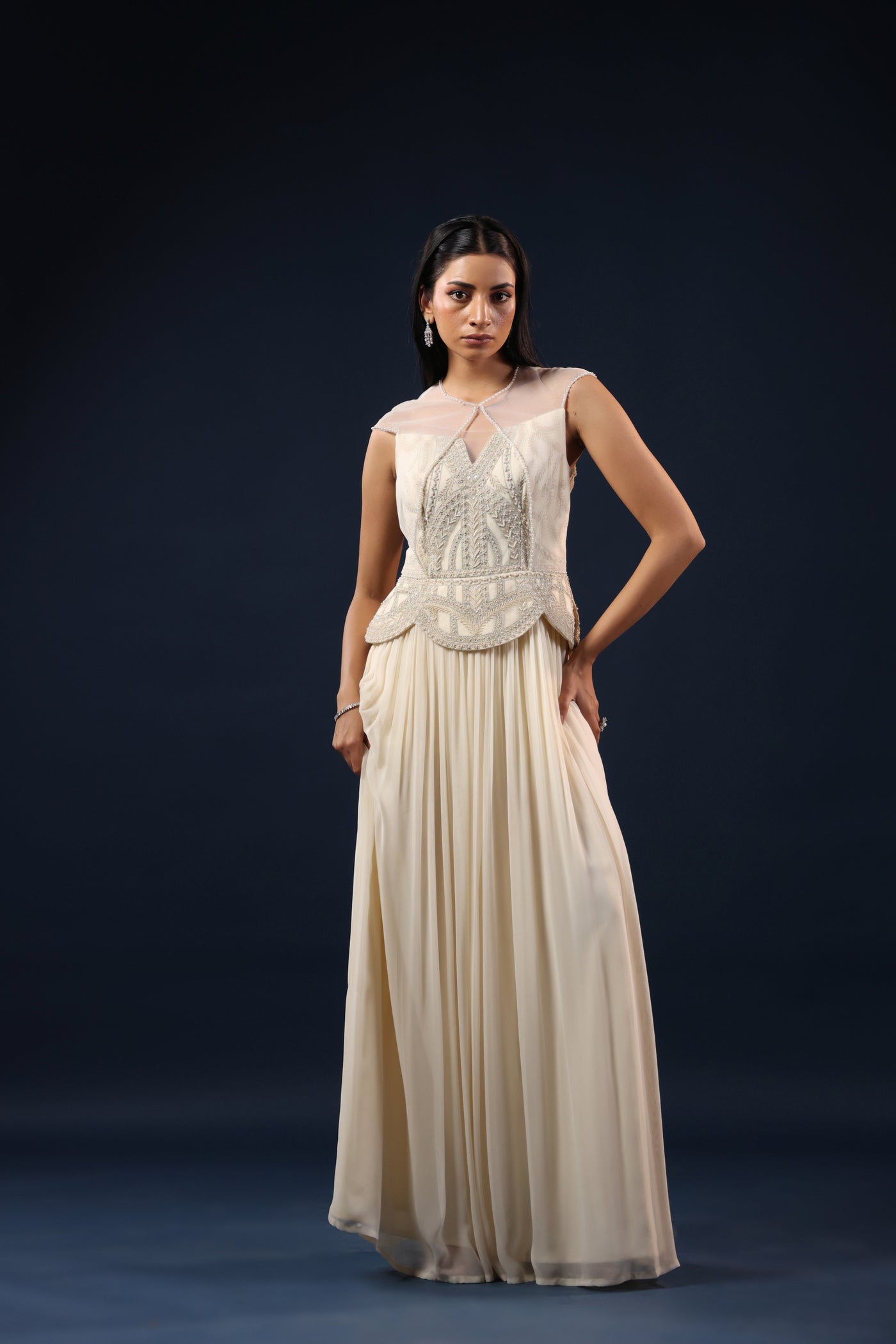 ELEGANT OFF WHITE GOWN WITH STYLISH NECK.