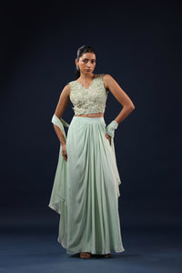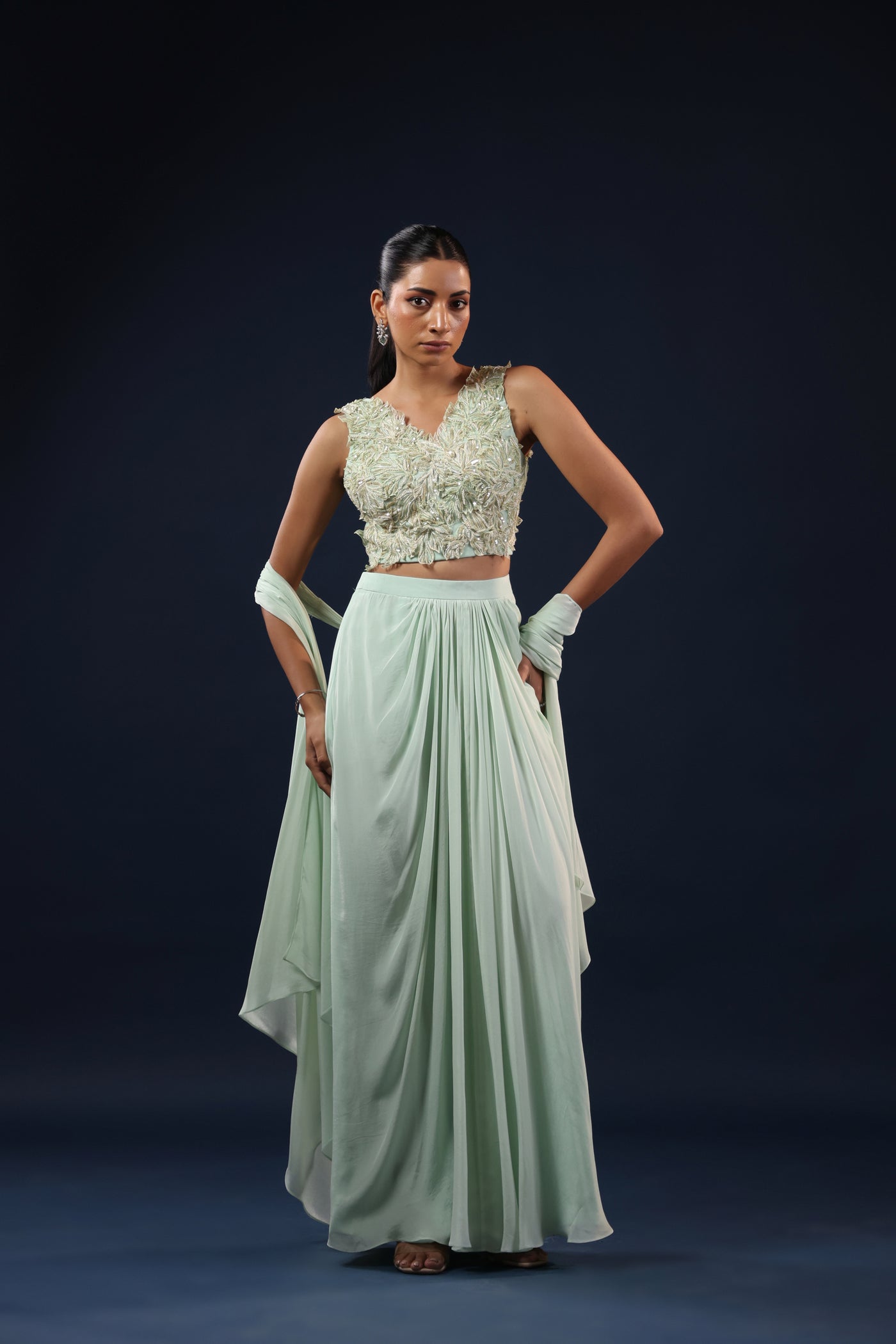 Inform when this item available AQUA EMBELLISHED CROP TOP WITH FLOWING SKIRT & DUPATTA SET.